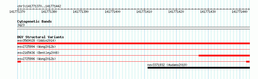 Variant DetailsVariant: essv6864750| Internal ID | 9915072 | | Landmark | | | Location Information | | | Cytoband | 3q23 | | Allele length | | Assembly | Allele length | | hg38 | 73 | | hg19 | 73 |