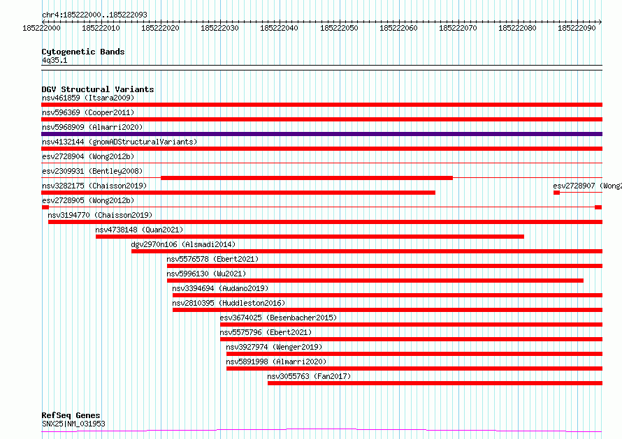 | | Variant Type | CNV deletion | | Copy Number | | | Allele State | | | Allele Origin | | | Probe Count | | | Validation Flag | | | Merged Status | S | | Merged Variants | esv2728905, esv2728904 | | Supporting Variants | | | Samples | SSM089 | | Known Genes | SNX25 | | Method | Sequencing | | Analysis | Breakdancer:4 times standard deviation,VariationHunter:4 times standard deviation and at least 3 supportting reads | | Platform | Illumina HiSeq 2000 | | Comments | | | Reference | Wong_et_al_2012b | | Pubmed ID | 23290073 | | Accession Number(s) | essv6865177