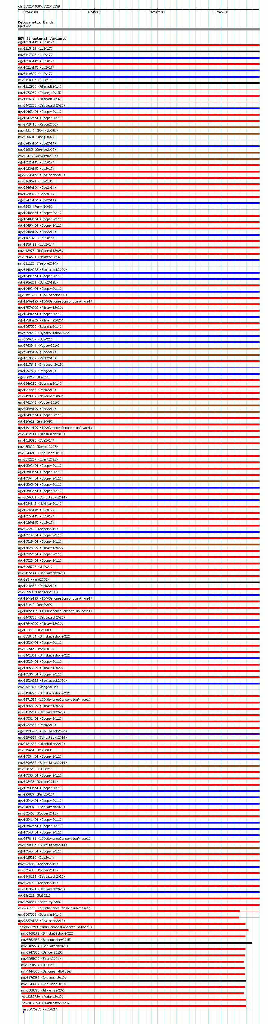 Variant DetailsVariant: essv6865558| Internal ID | 10262484 | | Landmark | | | Location Information | | | Cytoband | 6p21.32 | | Allele length | | Assembly | Allele length | | hg38 | 380 | | hg19 | 380 |
