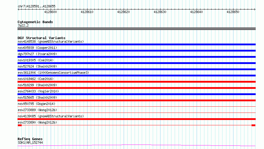 | Variant Type | CNV deletion | Copy Number | | Allele State | | Allele Origin | | Probe Count | | Validation Flag | | Merged Status | S | Merged Variants | esv2733890, esv2733889 | Supporting Variants | | Samples | SSM089 | Known Genes | SDK1 | Method | Sequencing | Analysis | Breakdancer:4 times standard deviation,VariationHunter:4 times standard deviation and at least 3 supportting reads | Platform | Illumina HiSeq 2000 | Comments | | Reference | Wong_et_al_2012b | Pubmed ID | 23290073 | Accession Number(s) | essv6865810