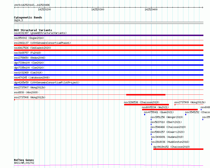 | | Variant Type | CNV deletion | | Copy Number | | | Allele State | | | Allele Origin | | | Probe Count | | | Validation Flag | | | Merged Status | S | | Merged Variants | esv2737908, esv2737907 | | Supporting Variants | | | Samples | SSM089 | | Known Genes | BAI1 | | Method | Sequencing | | Analysis | Breakdancer:4 times standard deviation,VariationHunter:4 times standard deviation and at least 3 supportting reads | | Platform | Illumina HiSeq 2000 | | Comments | | | Reference | Wong_et_al_2012b | | Pubmed ID | 23290073 | | Accession Number(s) | essv6866459