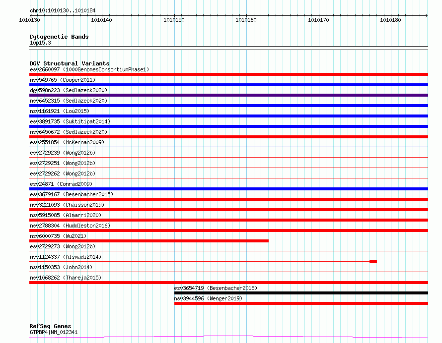 Variant DetailsVariant: essv6866657| Internal ID | 10263472 | | Landmark | | | Location Information | | | Cytoband | 10p15.3 | | Allele length | | Assembly | Allele length | | hg38 | 55 | | hg19 | 55 |