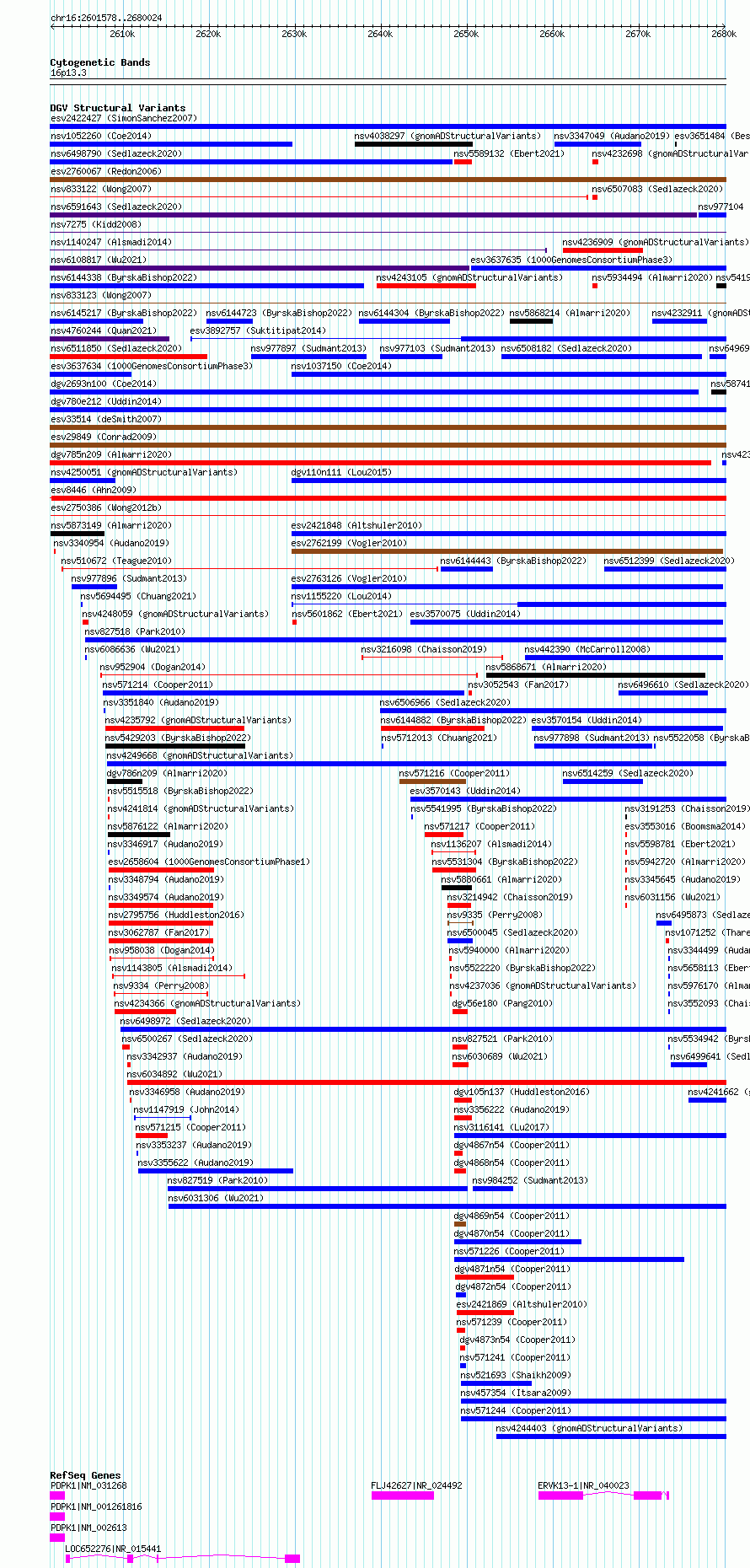 Variant DetailsVariant: essv6867753| Internal ID | 10264459 | | Landmark | | | Location Information | | | Cytoband | 16p13.3 | | Allele length | | Assembly | Allele length | | hg38 | 78447 | | hg19 | 78447 |