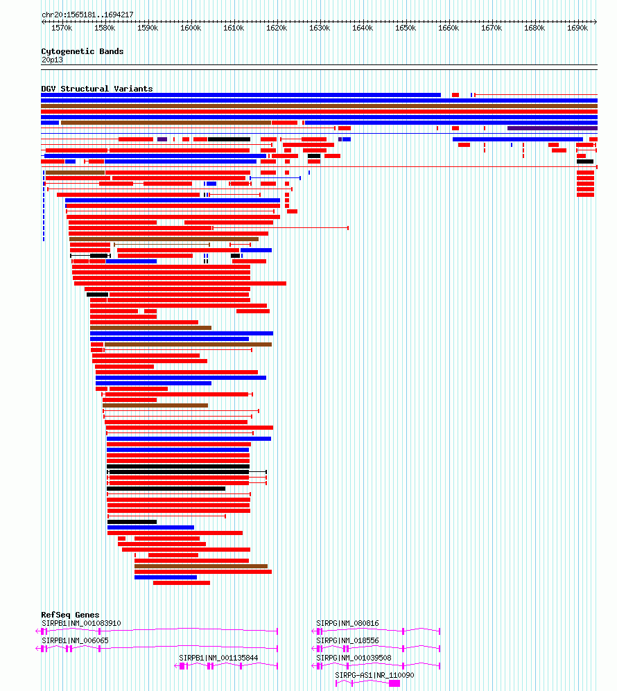 | | Variant Type | CNV deletion | | Copy Number | | | Allele State | | | Allele Origin | | | Probe Count | | | Validation Flag | | | Merged Status | S | | Merged Variants | esv2722071 | | Supporting Variants | | | Samples | SSM089 | | Known Genes | SIRPB1, SIRPG | | Method | Sequencing | | Analysis | Breakdancer:4 times standard deviation,VariationHunter:4 times standard deviation and at least 3 supportting reads | | Platform | Illumina HiSeq 2000 | | Comments | | | Reference | Wong_et_al_2012b | | Pubmed ID | 23290073 | | Accession Number(s) | essv6868206