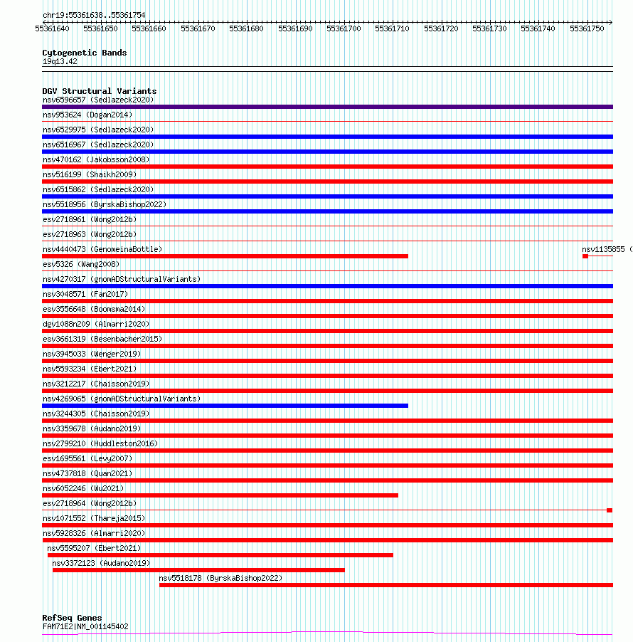 Variant DetailsVariant: essv6868488| Internal ID | 10265120 | | Landmark | | | Location Information | | | Cytoband | 19q13.42 | | Allele length | | Assembly | Allele length | | hg38 | 117 | | hg19 | 117 |