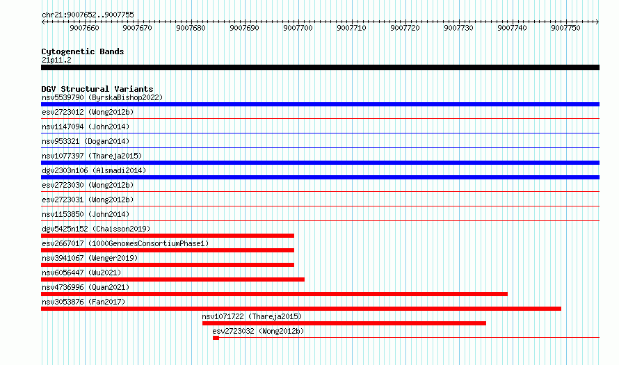 Variant DetailsVariant: essv6868596| Internal ID | 10265219 | | Landmark | | | Location Information | | | Cytoband | 21p11.2 | | Allele length | | Assembly | Allele length | | hg38 | 104 | | hg19 | 104 |