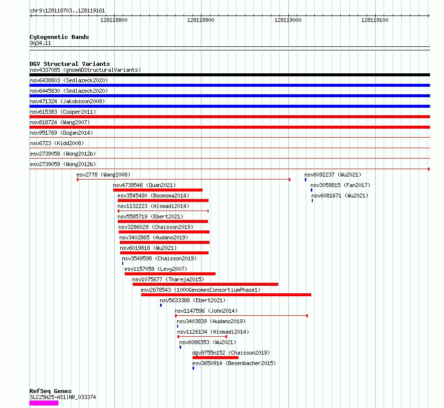 Variant DetailsVariant: essv6870438| Internal ID | 10266878 | | Landmark | | | Location Information | | | Cytoband | 9q34.11 | | Allele length | | Assembly | Allele length | | hg38 | 459 | | hg19 | 459 |