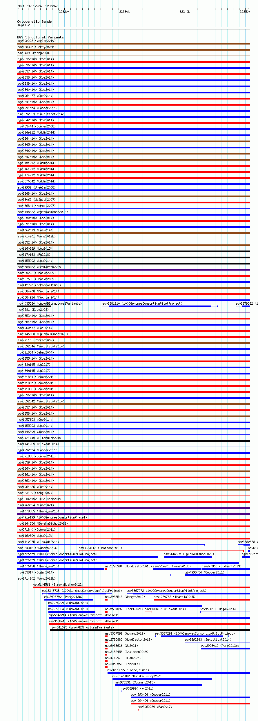 Variant DetailsVariant: essv6871104| Internal ID | 10267477 | | Landmark | | | Location Information | | | Cytoband | 16p11.2 | | Allele length | | Assembly | Allele length | | hg38 | 38471 | | hg19 | 38471 |