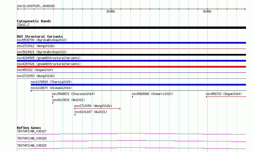 Variant DetailsVariant: essv6871619| Internal ID | 10267941 | | Landmark | | | Location Information | | | Cytoband | 21p11.2 | | Allele length | | Assembly | Allele length | | hg38 | 2368 | | hg19 | 2368 |