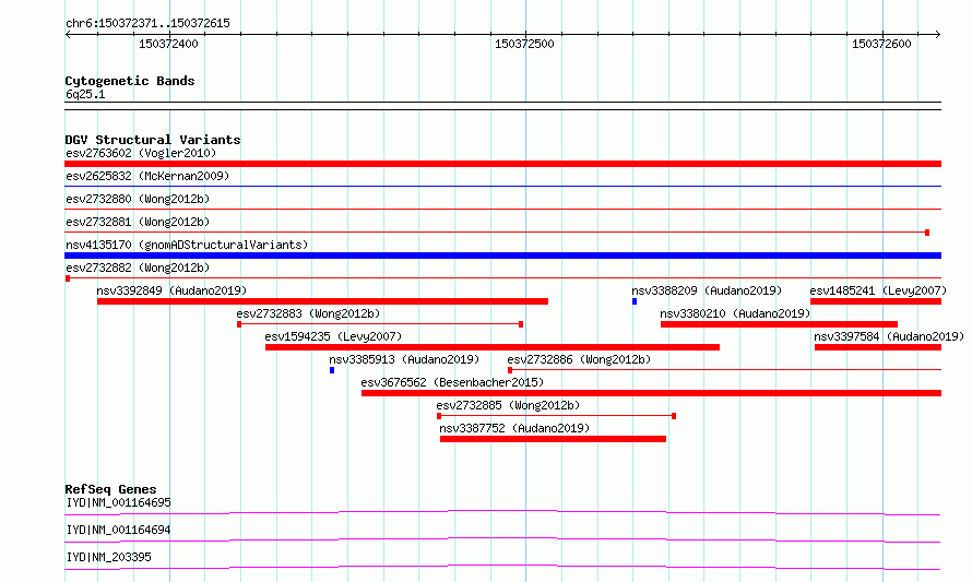 | Variant Type | CNV deletion | Copy Number | | Allele State | | Allele Origin | | Probe Count | | Validation Flag | | Merged Status | S | Merged Variants | esv2732882, esv2732880 | Supporting Variants | | Samples | SSM091 | Known Genes | IYD | Method | Sequencing | Analysis | Breakdancer:4 times standard deviation,VariationHunter:4 times standard deviation and at least 3 supportting reads | Platform | Illumina HiSeq 2000 | Comments | | Reference | Wong_et_al_2012b | Pubmed ID | 23290073 | Accession Number(s) | essv6872862