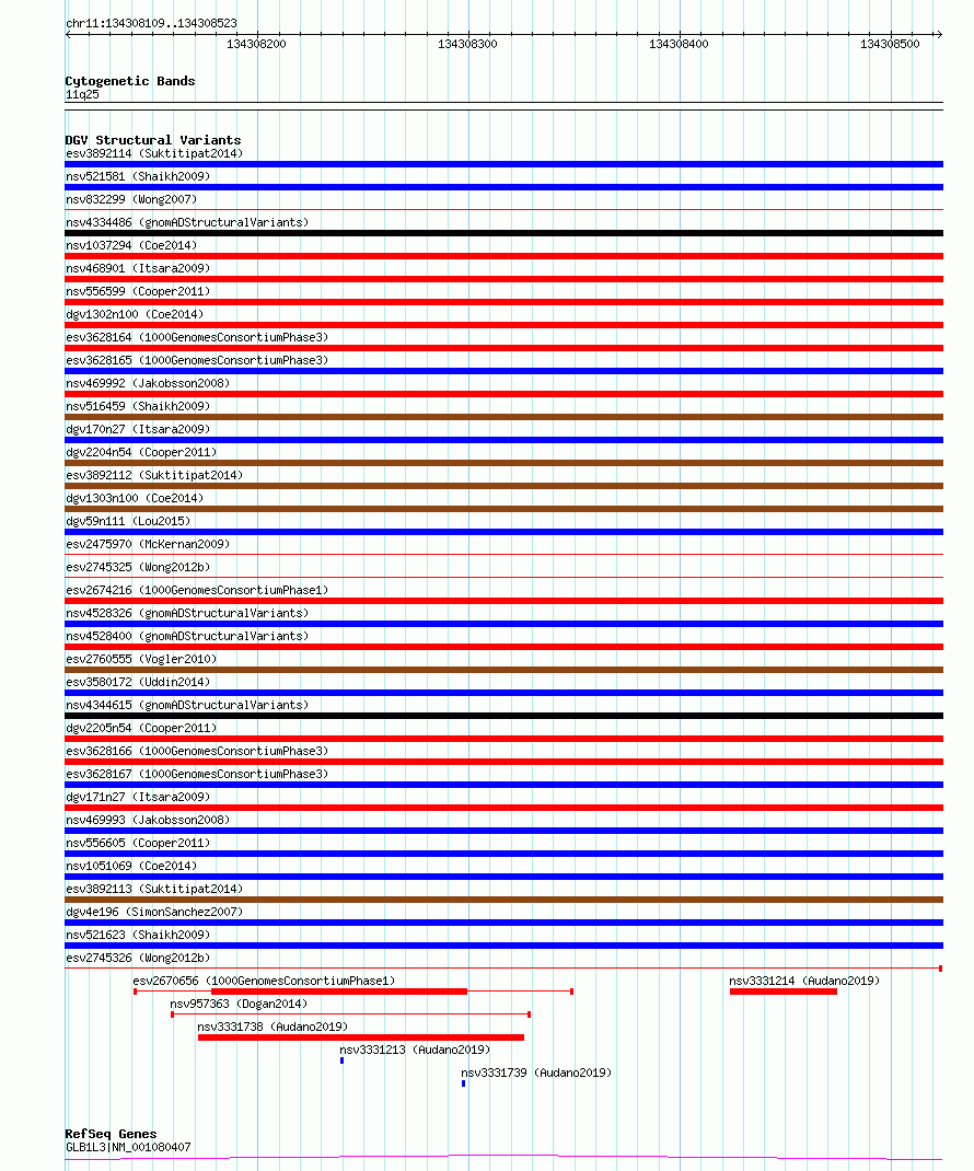 Variant DetailsVariant: essv6873628| Internal ID | 9923062 | | Landmark | | | Location Information | | | Cytoband | 11q25 | | Allele length | | Assembly | Allele length | | hg38 | 415 | | hg19 | 415 |