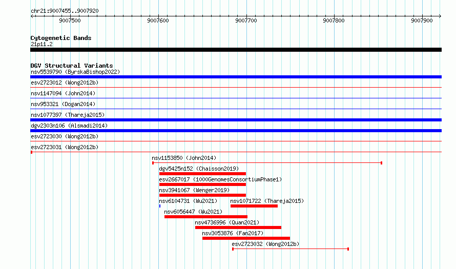 Variant DetailsVariant: essv6874603| Internal ID | 10270624 | | Landmark | | | Location Information | | | Cytoband | 21p11.2 | | Allele length | | Assembly | Allele length | | hg38 | 466 | | hg19 | 466 |