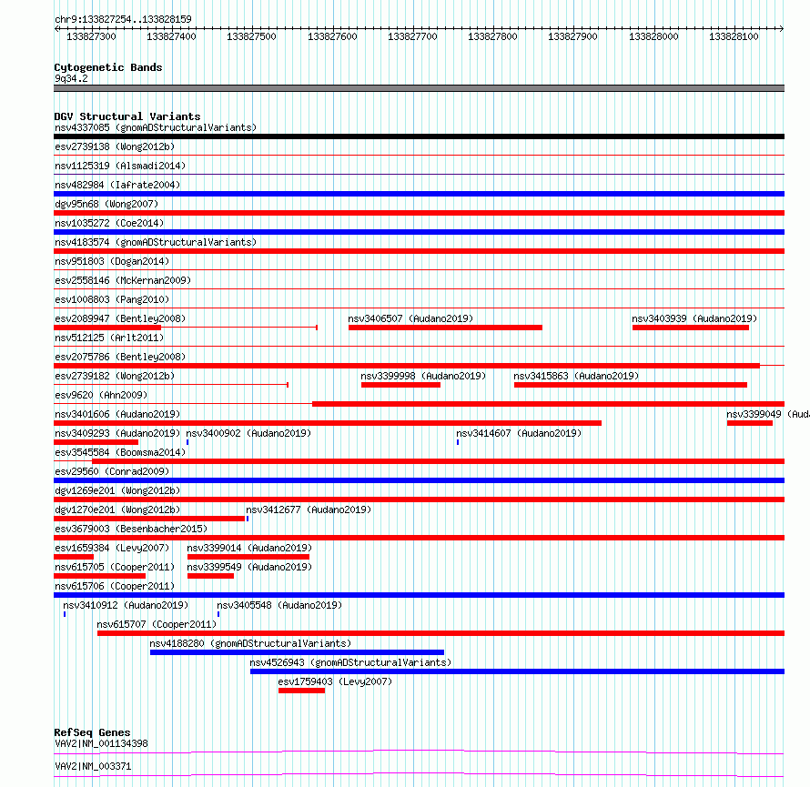 | | Variant Type | CNV deletion | | Copy Number | | | Allele State | | | Allele Origin | | | Probe Count | | | Validation Flag | | | Merged Status | S | | Merged Variants | esv2739186, esv2739183, esv2739188, esv2739138 | | Supporting Variants | | | Samples | SSM092 | | Known Genes | VAV2 | | Method | Sequencing | | Analysis | Breakdancer:4 times standard deviation,VariationHunter:4 times standard deviation and at least 3 supportting reads | | Platform | Illumina HiSeq 2000 | | Comments | | | Reference | Wong_et_al_2012b | | Pubmed ID | 23290073 | | Accession Number(s) | essv6876362