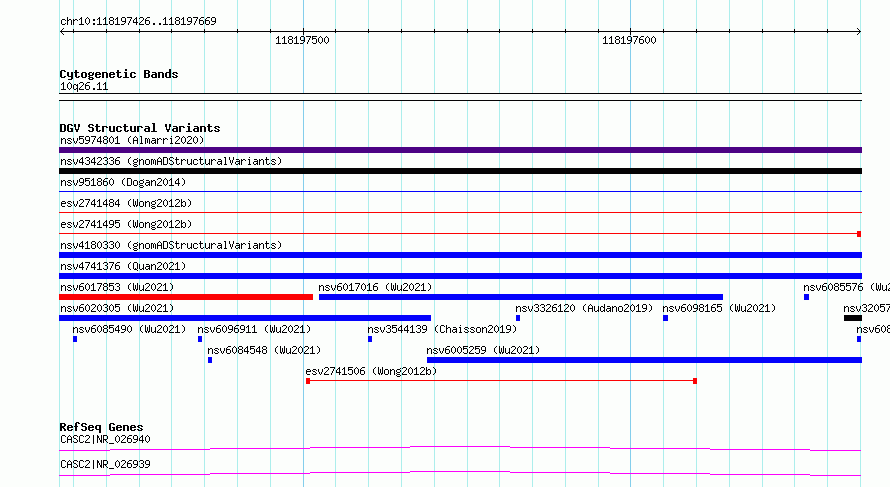 Variant DetailsVariant: essv6876467| Internal ID | 10272301 | | Landmark | | | Location Information | | | Cytoband | 10q26.11 | | Allele length | | Assembly | Allele length | | hg38 | 244 | | hg19 | 244 |