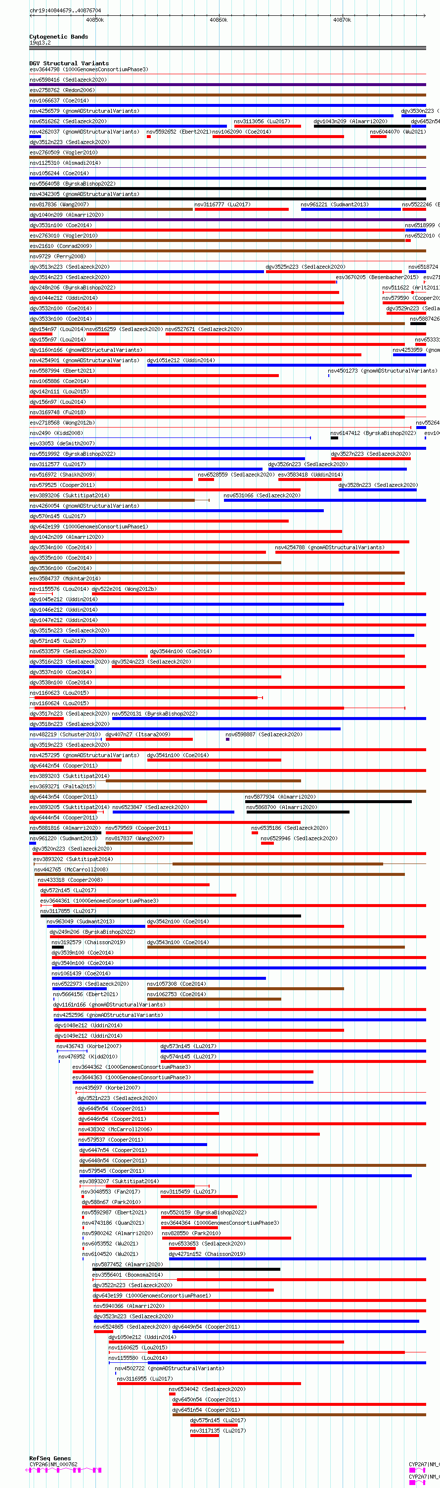 Variant DetailsVariant: essv6877456| Internal ID | 10273192 | | Landmark | | | Location Information | | | Cytoband | 19q13.2 | | Allele length | | Assembly | Allele length | | hg38 | 32026 | | hg19 | 32026 |