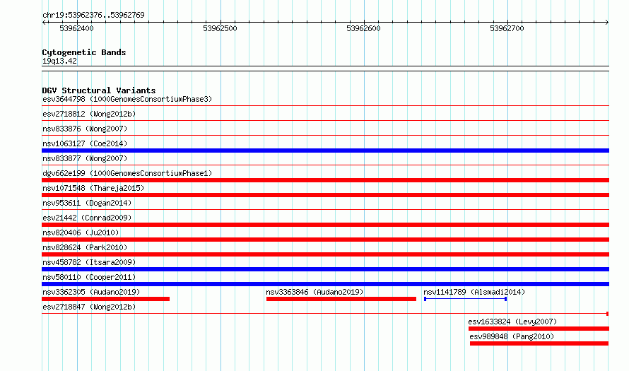 Variant DetailsVariant: essv6877484| Internal ID | 9926532 | | Landmark | | | Location Information | | | Cytoband | 19q13.42 | | Allele length | | Assembly | Allele length | | hg38 | 394 | | hg19 | 394 |