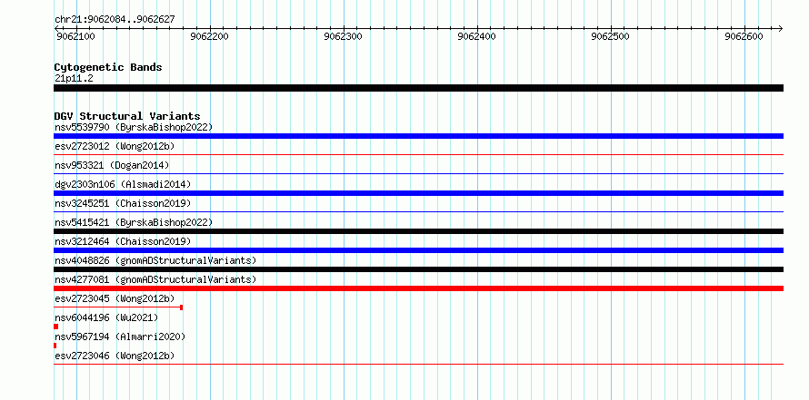 Variant DetailsVariant: essv6877590| Internal ID | 10273312 | | Landmark | | | Location Information | | | Cytoband | 21p11.2 | | Allele length | | Assembly | Allele length | | hg38 | 544 | | hg19 | 544 |