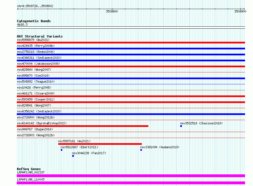 Variant DetailsVariant: essv6880961| Internal ID | 10276347 | | Landmark | | | Location Information | | | Cytoband | 4p16.3 | | Allele length | | Assembly | Allele length | | hg38 | 177 | | hg19 | 177 |