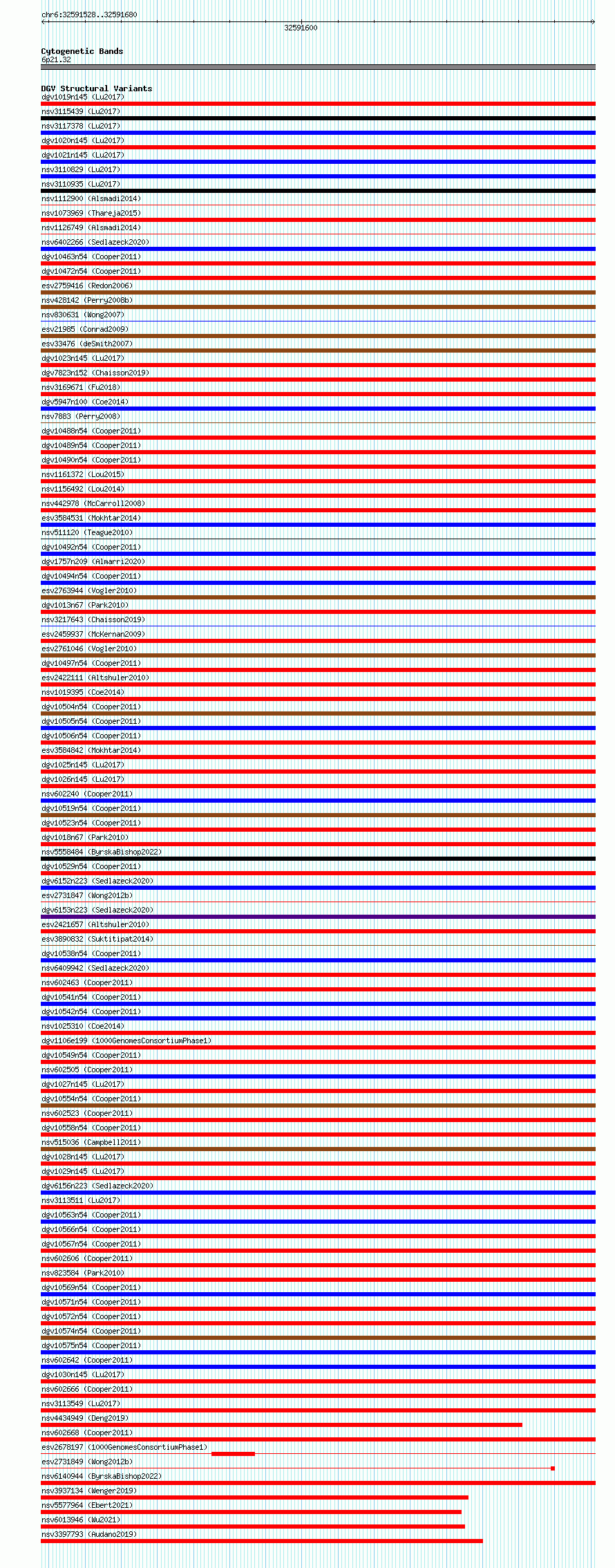 Variant DetailsVariant: essv6884214| Internal ID | 10279098 | | Landmark | | | Location Information | | | Cytoband | 6p21.32 | | Allele length | | Assembly | Allele length | | hg38 | 153 | | hg19 | 153 |