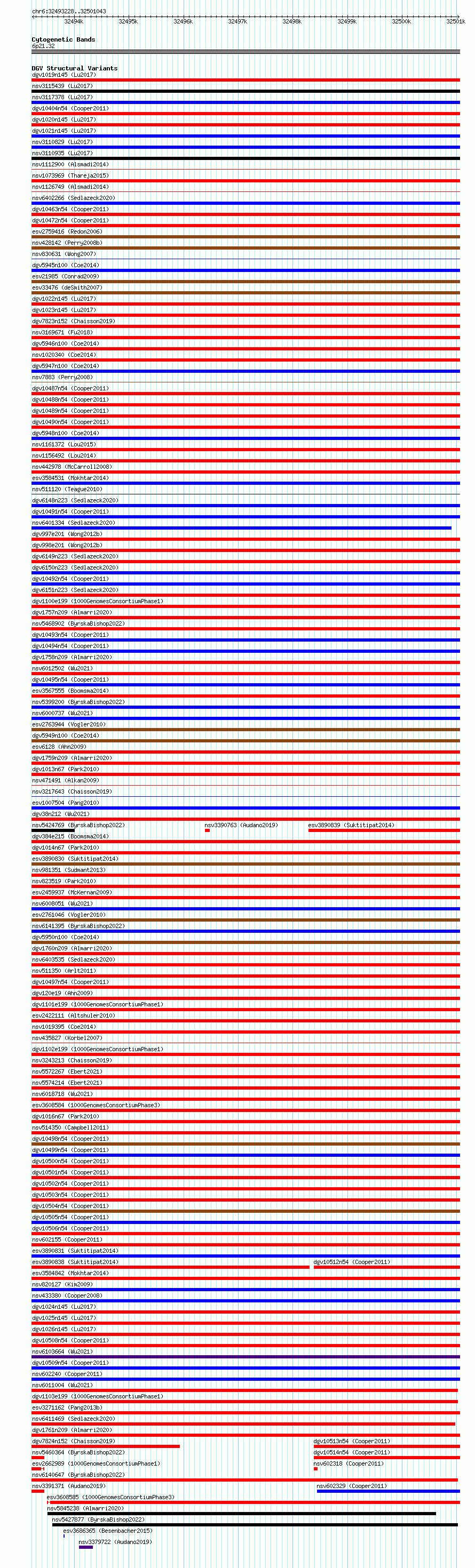 Variant DetailsVariant: essv6884597| Internal ID | 9986289 | | Landmark | | | Location Information | | | Cytoband | 6p21.32 | | Allele length | | Assembly | Allele length | | hg38 | 7816 | | hg19 | 7816 |
