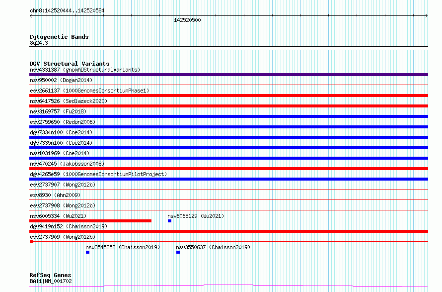 | | Variant Type | CNV deletion | | Copy Number | | | Allele State | | | Allele Origin | | | Probe Count | | | Validation Flag | | | Merged Status | S | | Merged Variants | esv2737909, esv2737907 | | Supporting Variants | | | Samples | SSM095 | | Known Genes | BAI1 | | Method | Sequencing | | Analysis | Breakdancer:4 times standard deviation,VariationHunter:4 times standard deviation and at least 3 supportting reads | | Platform | Illumina HiSeq 2000 | | Comments | | | Reference | Wong_et_al_2012b | | Pubmed ID | 23290073 | | Accession Number(s) | essv6884738