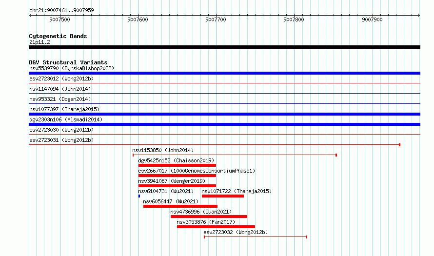 Variant DetailsVariant: essv6885885| Internal ID | 10280603 | | Landmark | | | Location Information | | | Cytoband | 21p11.2 | | Allele length | | Assembly | Allele length | | hg38 | 499 | | hg19 | 499 |