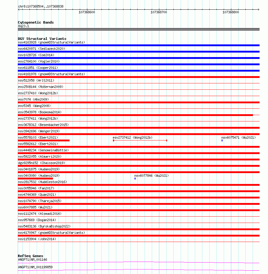 Variant DetailsVariant: essv6887550| Internal ID | 10282453 | | Landmark | | | Location Information | | | Cytoband | 8q23.1 | | Allele length | | Assembly | Allele length | | hg38 | 335 | | hg19 | 335 |