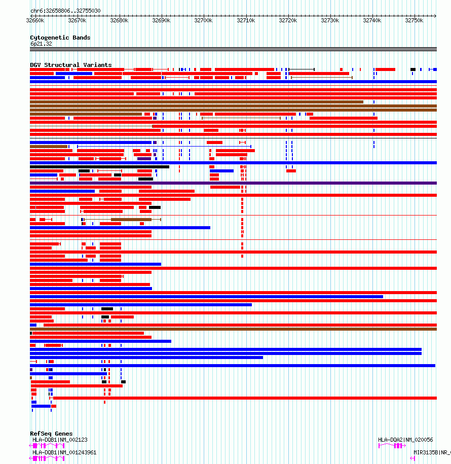 Variant DetailsVariant: essv6887855| Internal ID | 10013401 | | Landmark | | | Location Information | | | Cytoband | 6p21.32 | | Allele length | | Assembly | Allele length | | hg38 | 96225 | | hg19 | 96225 |