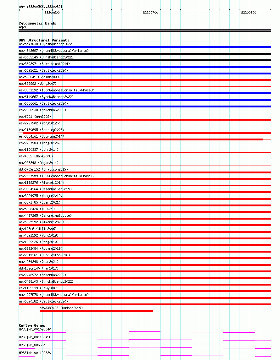 Variant DetailsVariant: essv6889762| Internal ID | 10284267 | | Landmark | | | Location Information | | | Cytoband | 4q21.23 | | Allele length | | Assembly | Allele length | | hg38 | 256 | | hg19 | 256 |