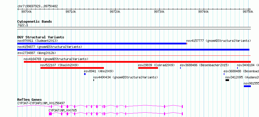 | Variant Type | CNV deletion | Copy Number | | Allele State | | Allele Origin | | Probe Count | | Validation Flag | | Merged Status | S | Merged Variants | esv2734887 | Supporting Variants | | Samples | SSM097 | Known Genes | CYP3A7, CYP3A7-CYP3AP1 | Method | Sequencing | Analysis | Breakdancer:4 times standard deviation,VariationHunter:4 times standard deviation and at least 3 supportting reads | Platform | Illumina HiSeq 2000 | Comments | | Reference | Wong_et_al_2012b | Pubmed ID | 23290073 | Accession Number(s) | essv6890481