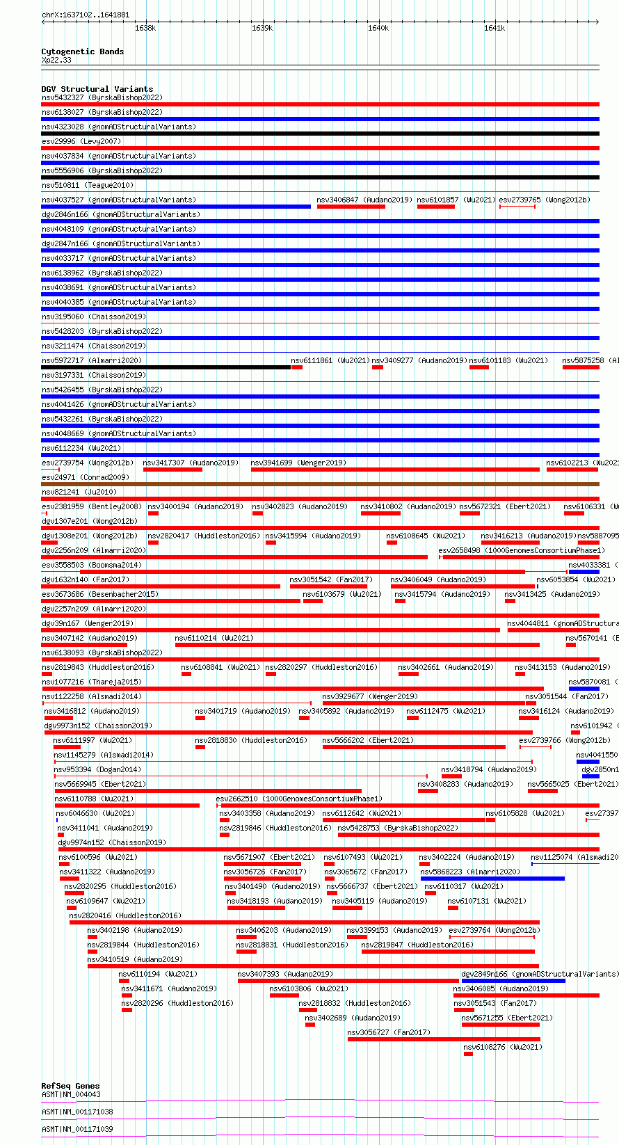 Variant DetailsVariant: essv6890611| Internal ID | 10285031 | | Landmark | | | Location Information | | | Cytoband | Xp22.33 | | Allele length | | Assembly | Allele length | | hg38 | 4780 | | hg19 | 4780 |