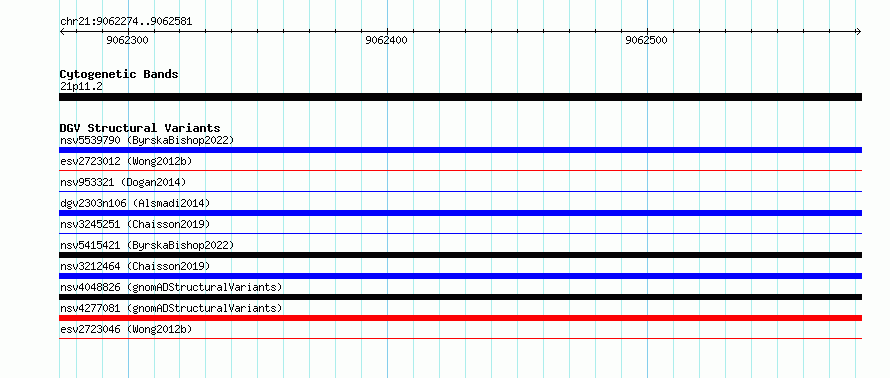 Variant DetailsVariant: essv6892202| Internal ID | 10286464 | | Landmark | | | Location Information | | | Cytoband | 21p11.2 | | Allele length | | Assembly | Allele length | | hg38 | 308 | | hg19 | 308 |