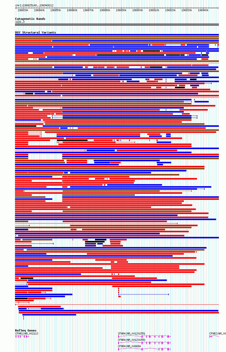 | | Variant Type | CNV deletion | | Copy Number | | | Allele State | | | Allele Origin | | | Probe Count | | | Validation Flag | | | Merged Status | S | | Merged Variants | esv2721040 | | Supporting Variants | | | Samples | SSM098 | | Known Genes | CFHR1, CFHR2, CFHR4 | | Method | Sequencing | | Analysis | Breakdancer:4 times standard deviation,VariationHunter:4 times standard deviation and at least 3 supportting reads | | Platform | Illumina HiSeq 2000 | | Comments | | | Reference | Wong_et_al_2012b | | Pubmed ID | 23290073 | | Accession Number(s) | essv6892457