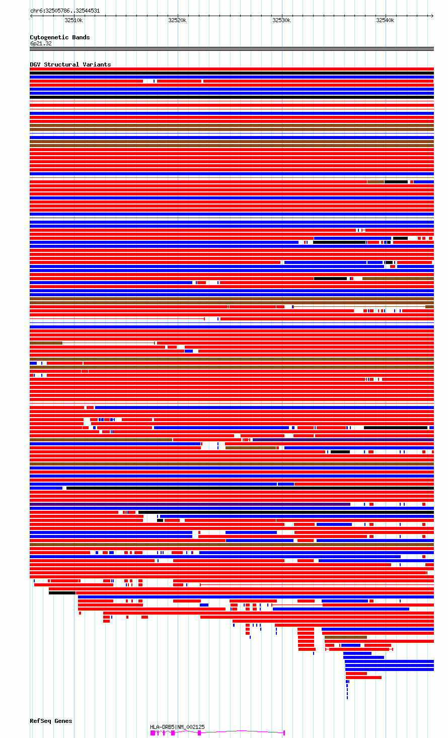 Variant DetailsVariant: essv6893501| Internal ID | 10287632 | | Landmark | | | Location Information | | | Cytoband | 6p21.32 | | Allele length | | Assembly | Allele length | | hg38 | 38746 | | hg19 | 38746 |