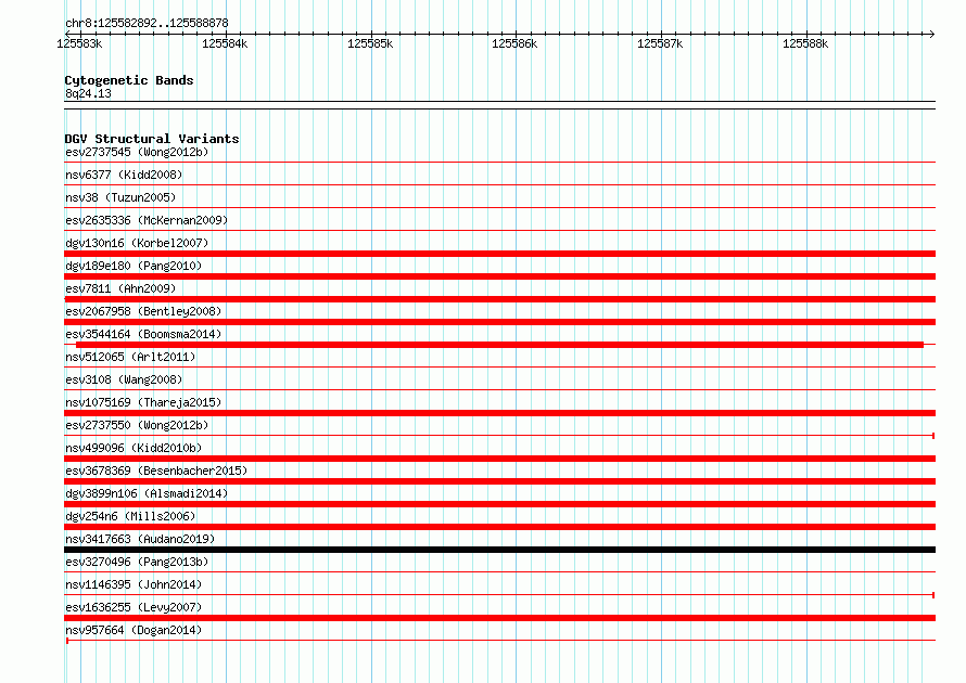 Variant DetailsVariant: essv6894146| Internal ID | 9941528 | | Landmark | | | Location Information | | | Cytoband | 8q24.13 | | Allele length | | Assembly | Allele length | | hg38 | 5987 | | hg19 | 5987 |