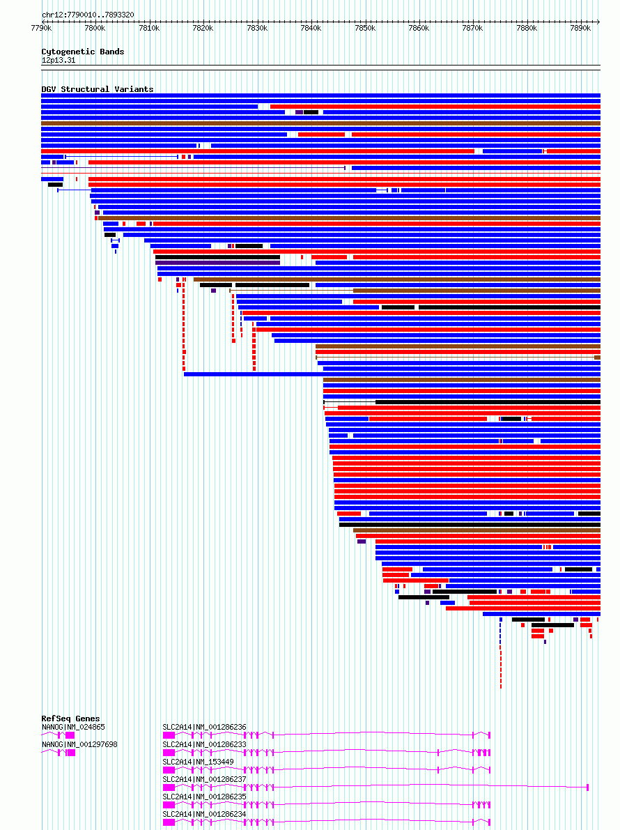 | | Variant Type | CNV deletion | | Copy Number | | | Allele State | | | Allele Origin | | | Probe Count | | | Validation Flag | | | Merged Status | S | | Merged Variants | esv2745493 | | Supporting Variants | | | Samples | SSM098 | | Known Genes | NANOG, SLC2A14 | | Method | Sequencing | | Analysis | Breakdancer:4 times standard deviation,VariationHunter:4 times standard deviation and at least 3 supportting reads | | Platform | Illumina HiSeq 2000 | | Comments | | | Reference | Wong_et_al_2012b | | Pubmed ID | 23290073 | | Accession Number(s) | essv6894613