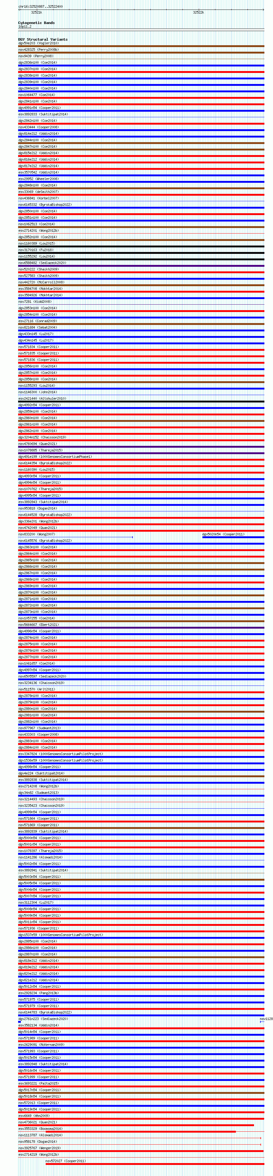 Variant DetailsVariant: essv6895097| Internal ID | 10289069 | | Landmark | | | Location Information | | | Cytoband | 16p11.2 | | Allele length | | Assembly | Allele length | | hg38 | 1514 | | hg19 | 1514 |