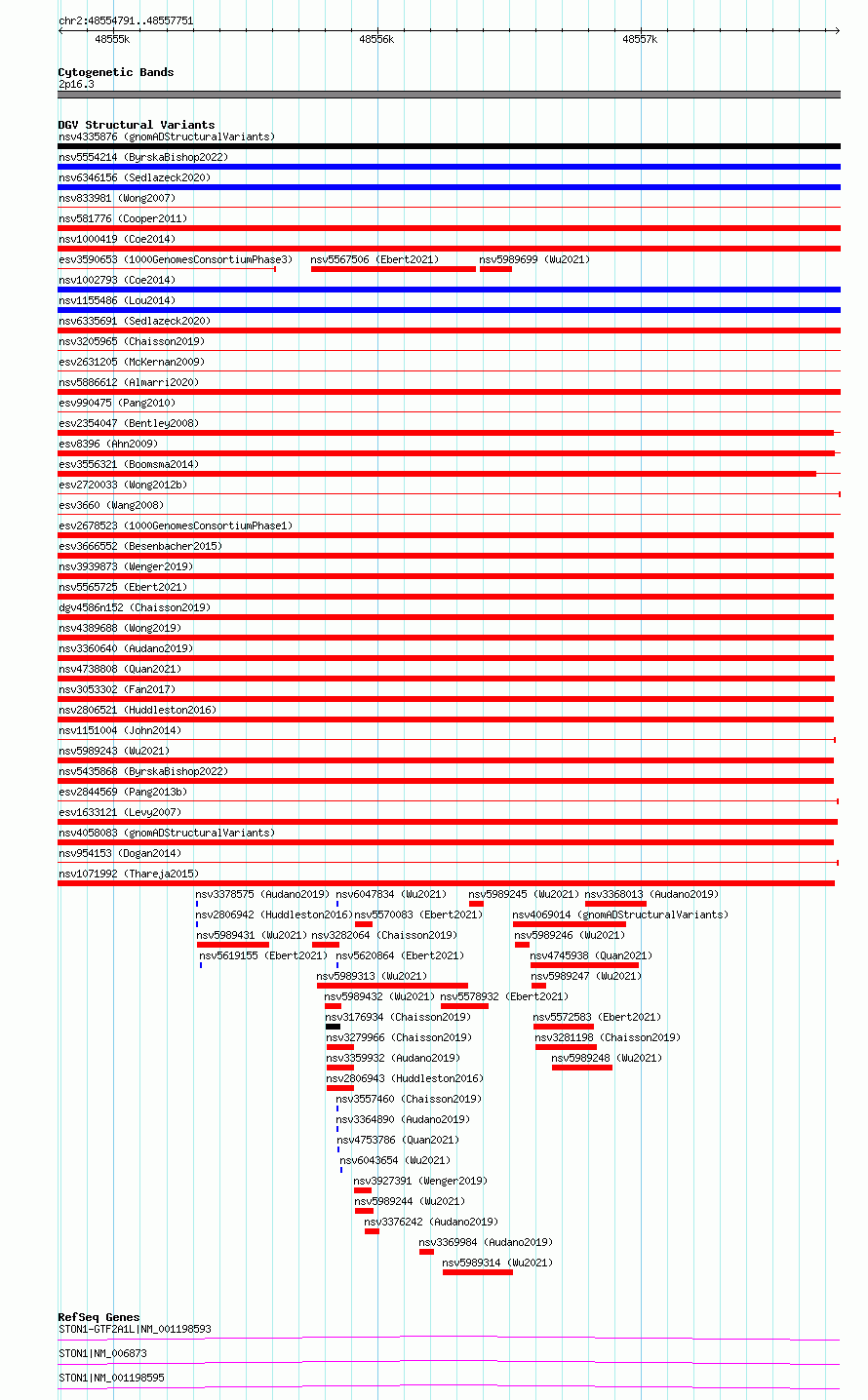 Variant DetailsVariant: essv6896058| Internal ID | 10289934 | | Landmark | | | Location Information | | | Cytoband | 2p16.3 | | Allele length | | Assembly | Allele length | | hg38 | 2961 | | hg19 | 2961 |