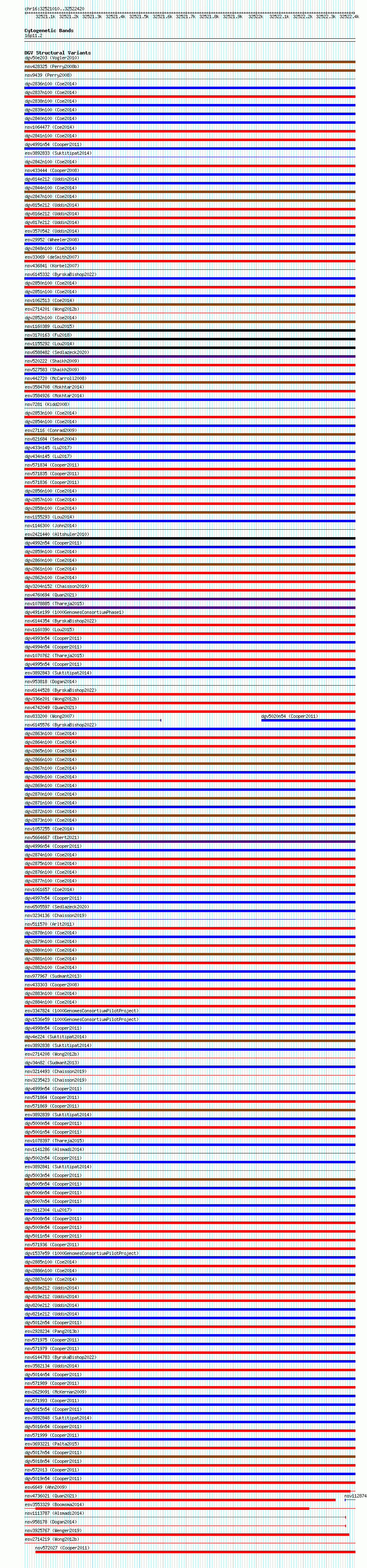 Variant DetailsVariant: essv6898012| Internal ID | 10292130 | | Landmark | | | Location Information | | | Cytoband | 16p11.2 | | Allele length | | Assembly | Allele length | | hg38 | 1411 | | hg19 | 1411 |