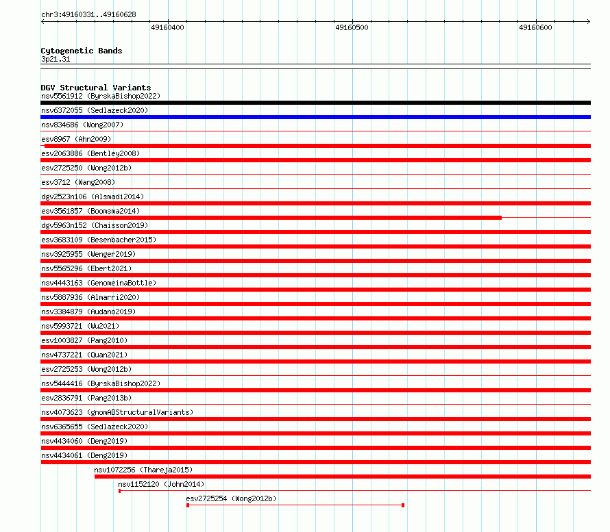 Variant DetailsVariant: essv6899052| Internal ID | 10292867 | | Landmark | | | Location Information | | | Cytoband | 3p21.31 | | Allele length | | Assembly | Allele length | | hg38 | 298 | | hg19 | 298 |