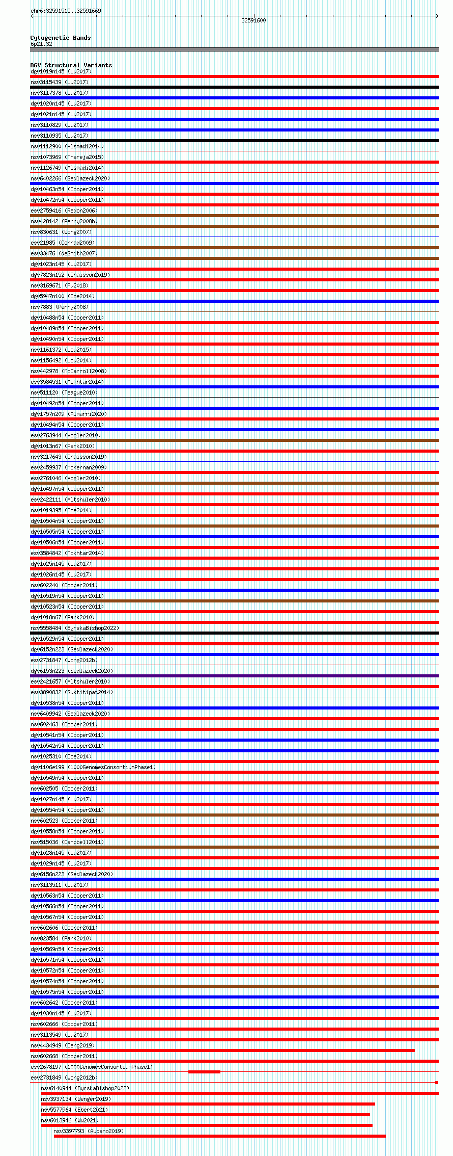 Variant DetailsVariant: essv6899685| Internal ID | 10292296 | | Landmark | | | Location Information | | | Cytoband | 6p21.32 | | Allele length | | Assembly | Allele length | | hg38 | 155 | | hg19 | 155 |
