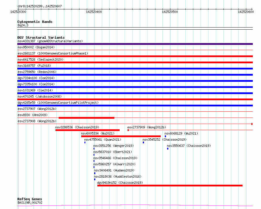 | | Variant Type | CNV deletion | | Copy Number | | | Allele State | | | Allele Origin | | | Probe Count | | | Validation Flag | | | Merged Status | S | | Merged Variants | esv2737908, esv2737907 | | Supporting Variants | | | Samples | SSM100 | | Known Genes | BAI1 | | Method | Sequencing | | Analysis | Breakdancer:4 times standard deviation,VariationHunter:4 times standard deviation and at least 3 supportting reads | | Platform | Illumina HiSeq 2000 | | Comments | | | Reference | Wong_et_al_2012b | | Pubmed ID | 23290073 | | Accession Number(s) | essv6900236