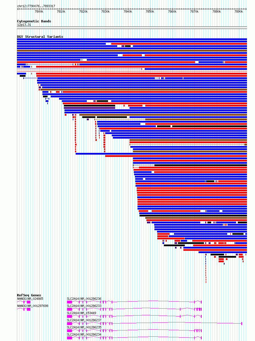 | | Variant Type | CNV deletion | | Copy Number | | | Allele State | | | Allele Origin | | | Probe Count | | | Validation Flag | | | Merged Status | S | | Merged Variants | esv2745493 | | Supporting Variants | | | Samples | SSM100 | | Known Genes | NANOG, SLC2A14 | | Method | Sequencing | | Analysis | Breakdancer:4 times standard deviation,VariationHunter:4 times standard deviation and at least 3 supportting reads | | Platform | Illumina HiSeq 2000 | | Comments | | | Reference | Wong_et_al_2012b | | Pubmed ID | 23290073 | | Accession Number(s) | essv6900617