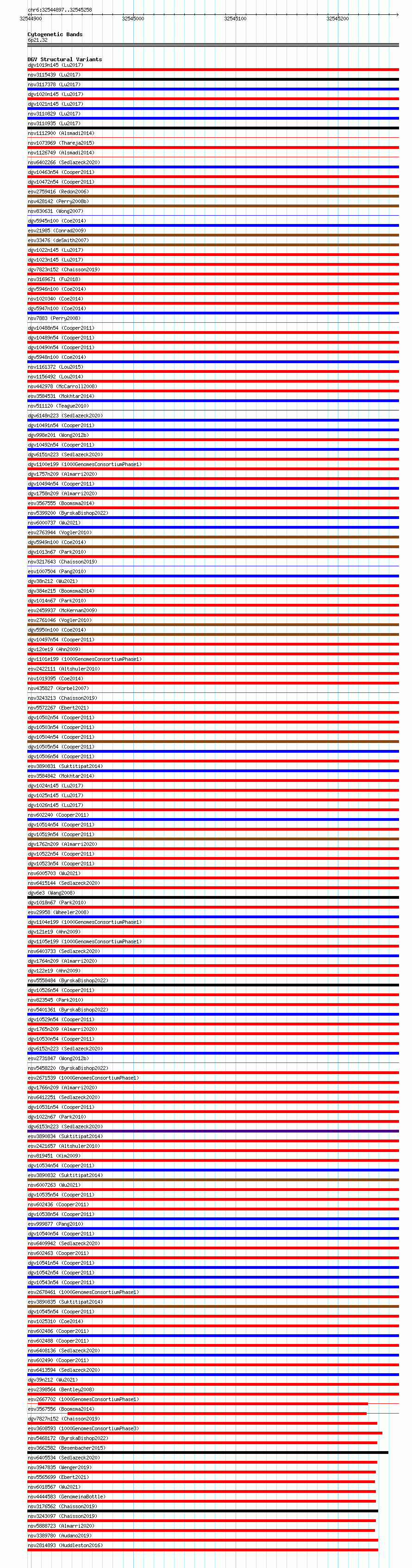 Variant DetailsVariant: essv6903703| Internal ID | 10015417 | | Landmark | | | Location Information | | | Cytoband | 6p21.32 | | Allele length | | Assembly | Allele length | | hg38 | 362 | | hg19 | 362 |