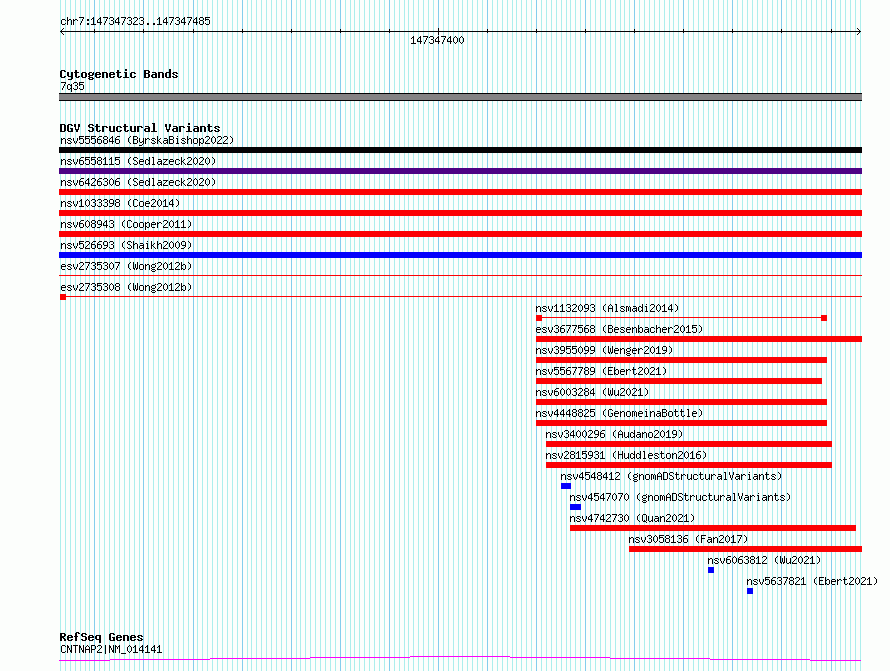 | | Variant Type | CNV deletion | | Copy Number | | | Allele State | | | Allele Origin | | | Probe Count | | | Validation Flag | | | Merged Status | S | | Merged Variants | esv2735307, esv2735308 | | Supporting Variants | | | Samples | SSM013 | | Known Genes | CNTNAP2, MIR548I4 | | Method | Sequencing | | Analysis | Breakdancer:4 times standard deviation,VariationHunter:4 times standard deviation and at least 3 supportting reads | | Platform | Illumina HiSeq 2000 | | Comments | | | Reference | Wong_et_al_2012b | | Pubmed ID | 23290073 | | Accession Number(s) | essv6904071