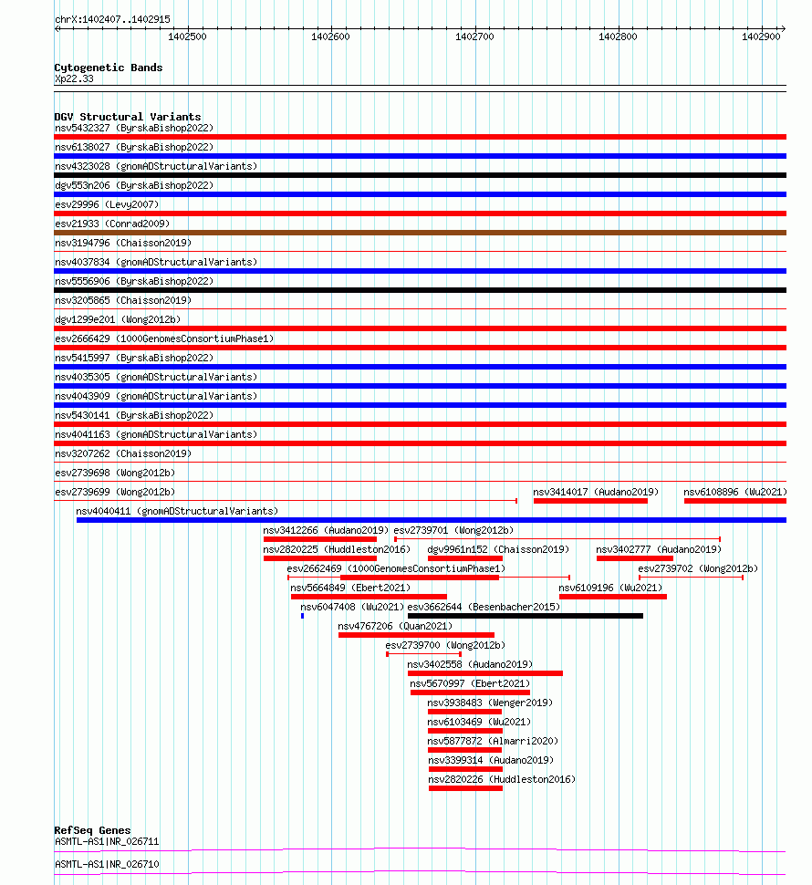Variant DetailsVariant: essv6904161| Internal ID | 10015829 | | Landmark | | | Location Information | | | Cytoband | Xp22.33 | | Allele length | | Assembly | Allele length | | hg38 | 509 | | hg19 | 509 |