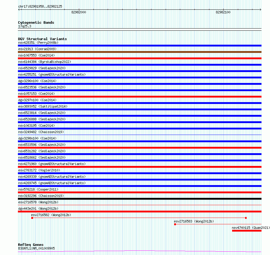 Variant DetailsVariant: essv6905612| Internal ID | 10016875 | | Landmark | | | Location Information | | | Cytoband | 17q25.3 | | Allele length | | Assembly | Allele length | | hg38 | 168 | | hg19 | 168 |