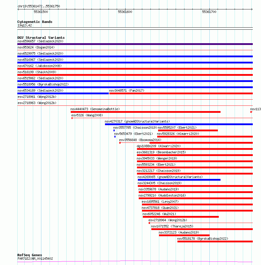 Variant DetailsVariant: essv6905897| Internal ID | 10016579 | | Landmark | | | Location Information | | | Cytoband | 19q13.42 | | Allele length | | Assembly | Allele length | | hg38 | 279 | | hg19 | 279 |