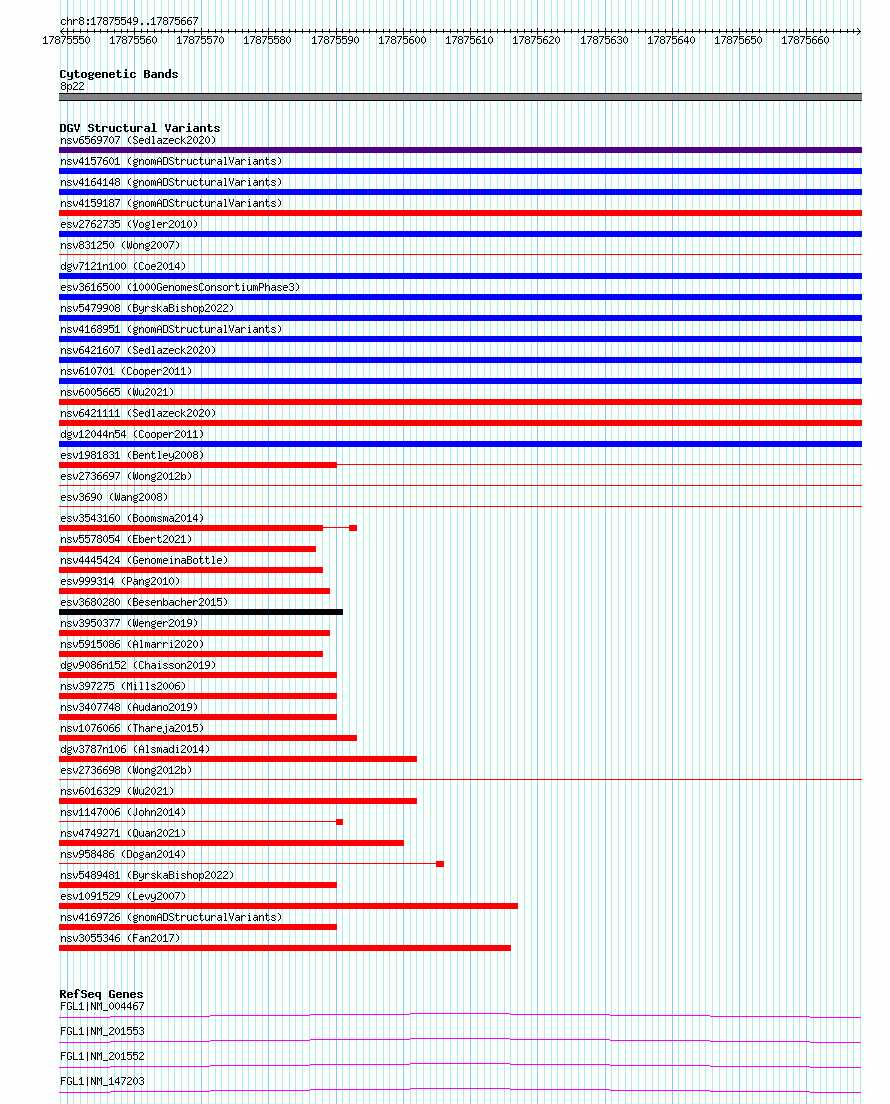 Variant DetailsVariant: essv6908214| Internal ID | 10019145 | | Landmark | | | Location Information | | | Cytoband | 8p22 | | Allele length | | Assembly | Allele length | | hg38 | 119 | | hg19 | 119 |