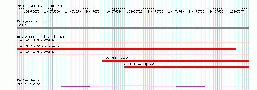 Variant DetailsVariant: essv6908947| Internal ID | 10018485 | | Landmark | | | Location Information | | | Cytoband | 12q23.3 | | Allele length | | Assembly | Allele length | | hg38 | 112 | | hg19 | 112 |